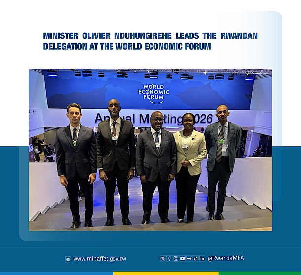 Davos, 19–23 January 2026 - Minister Olivier Nduhungirehe led Rwanda’s delegation to the World Economic Forum in Davos, Switzerland, alongside Minister of ICT and Innovation Paula Ingabire and Rwanda Development Board CEO Jean Guy K. Africa.