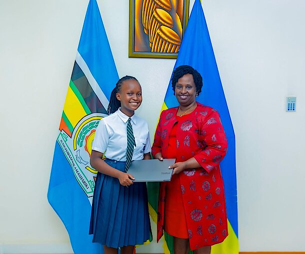 Kigali, 11 March 2026 - Minister of State Dr. Usta Kaitesi congratulated and awarded Atete Kagorora Arianah, a Rwandan secondary school student who emerged as the winner of the 2024 EAC Essay Writing Competition.